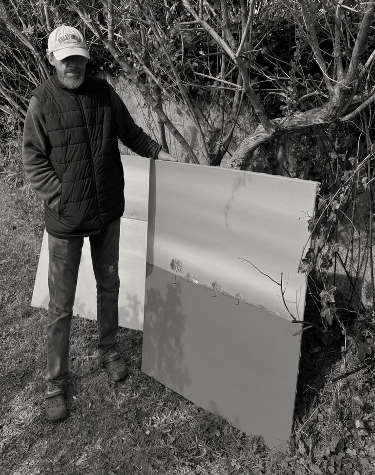 There is hope in the air - like the promise of tomorrow after a fulfilling day. His work brings a sense of joy, warmth, and order - like a summer memory softened by time. A quiet harmony lingers between the trees and houses, suggesting comfort and routine. Matteo's work carries a quiet poetry - minimal yet emotionally layered. His use of expansive negative space, soft skies, and distant dwellings allows the viewer to breathe and reflect.